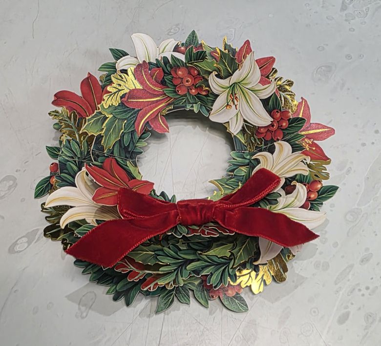 A keepsake pop up greeting card featuring a holiday wreath with a velvet bow.