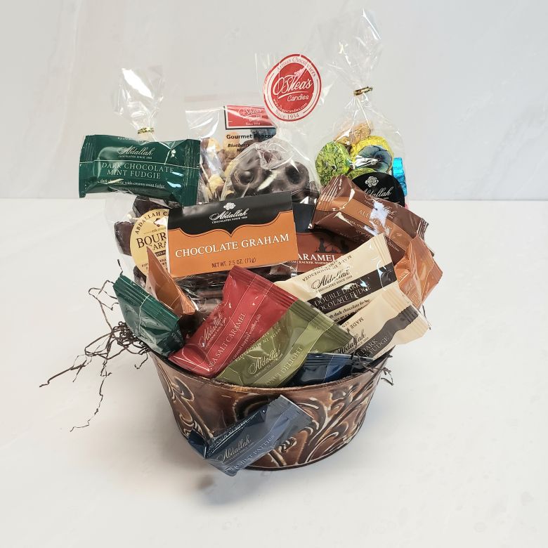 A decadent mix of amazing chocolate treats including chocolate covered pretzels, smores, chocolate covered graham crackers, chocolate drizzled popcorn, caramel bourbon chocolates, and a mix of twelve chocolate singles including peppermint, coconut, sea salt and caramel and peanut butter crisp.