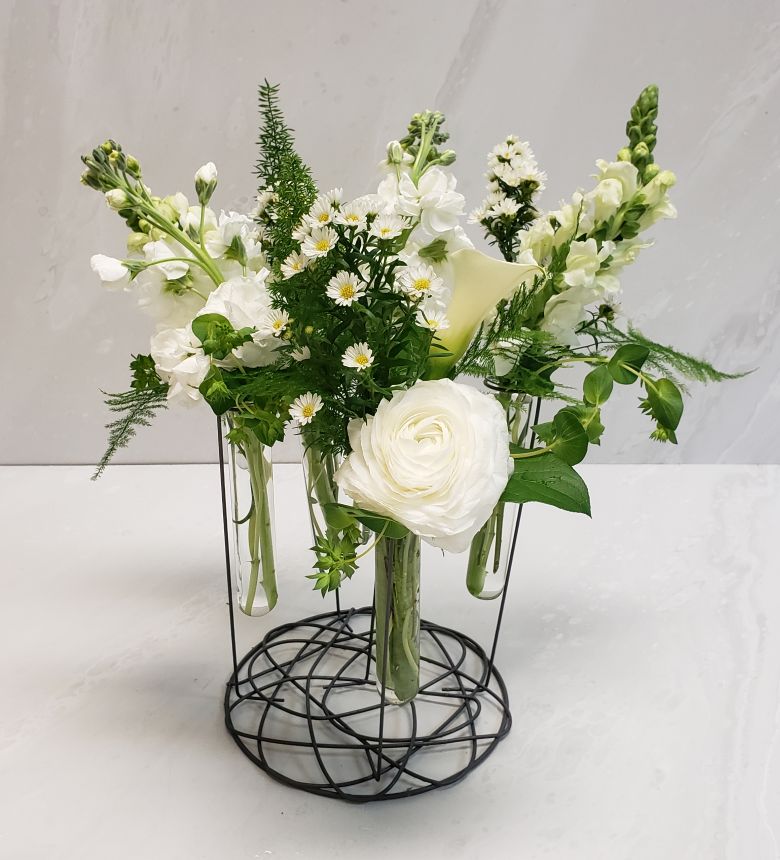This delightful design features a keepsake stand with a collection of glass tubes all filled with an enchanting garden of crisp white blooms and foliage.