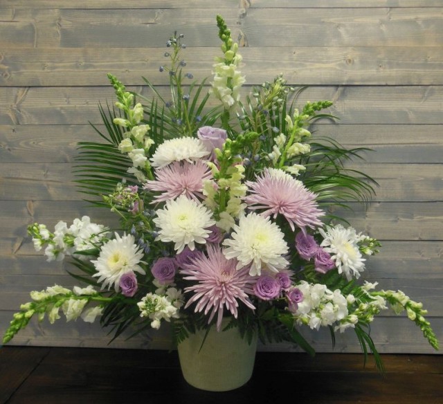 A soft mix of snap dragons, stock, cremons, fuji mums, and spray roses.