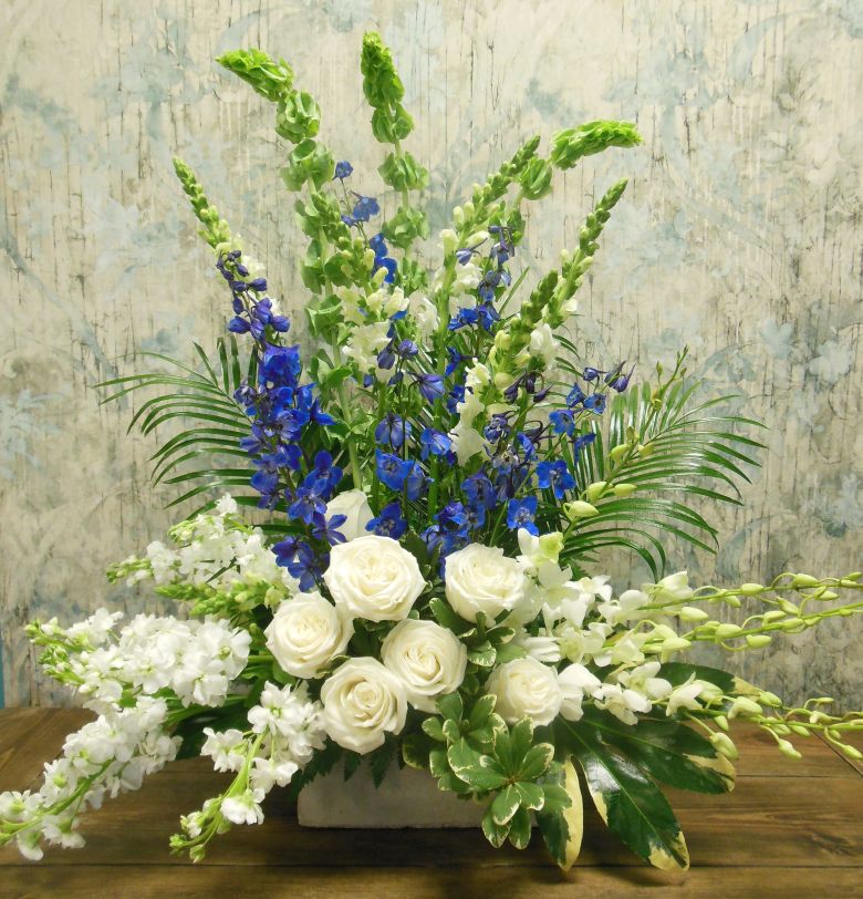 A sympathy arrangement of vibrant blue delphinium combined with a peaceful selection of white blooms including roses, orchids and fragrant stock.