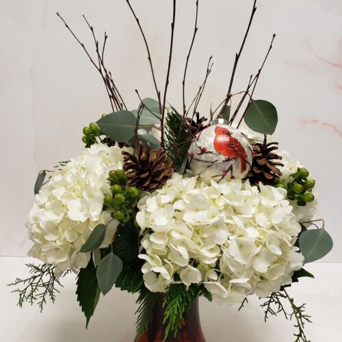 A garden holiday arrangement of white hydrangeas with apple green hypericum berries, pinecones, evergreens and birch branches designed in a ruby red glass gathering vase with a keepsake ornament. Ornament may vary.