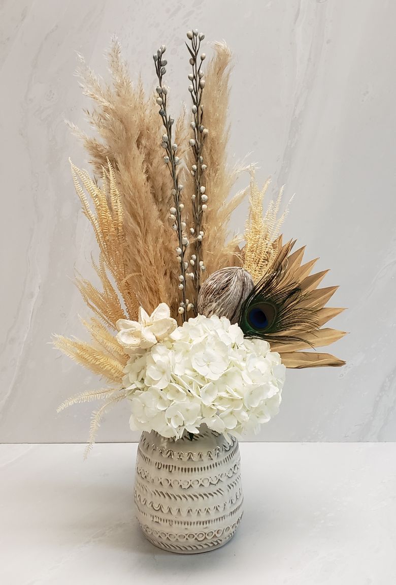 A boho dream of mixed dried elements including sun palm, helecho fern, moti sticks, bullet flower, mintolla pod and pampas plumes with fresh accent of hydrangea with a peacock feather for a pop of color all arranged in a keepsake ceramic vase.