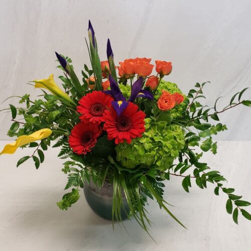 A vibrant design in golden yellow, ruby red, cobalt blue, pumpkin orange and emerald green blooms.