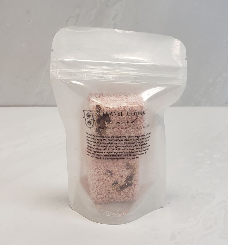 Cleanse Gourmet set of Two mood boosting shower steamers in a mix of pepperberry, rose and peppermint.