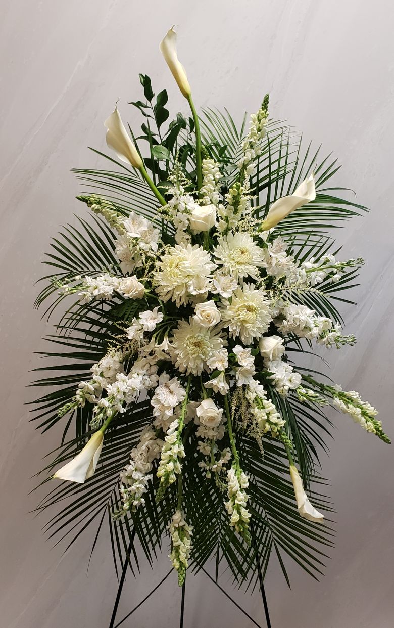 A classic tribute of calla lilies, snapdragons, stock, fuji mums, alstromeria and roses presented on an easel.