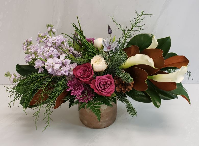 A fanciful floral design featuring fragrant stock, plum rose blooms, calla lilies, ranunculus and clematis paired with evergreens and magnolia.