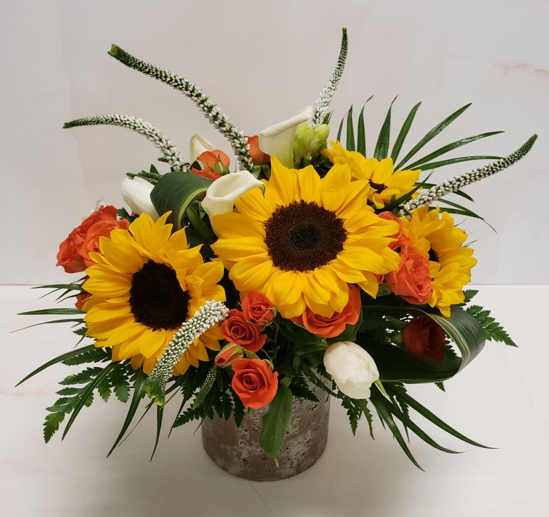 Bright mix of sunflowers, veronica, tulips, calla lilies, and miniature garden roses with tropical palm fronds and aspidistra leaves arranged in a stone vessel.