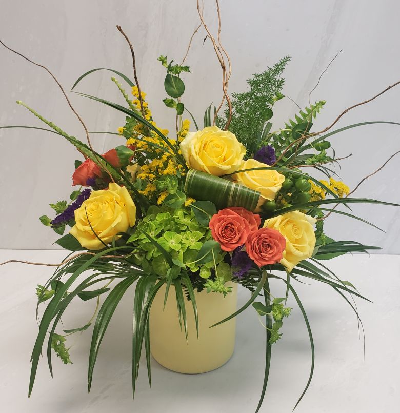 A vibrant sunset mix of yellow roses, orange miniature roses with lime hydrangeas accented with statice, solidago, hypericum with aspidistra, palm and foxtail in a glass cylinder.