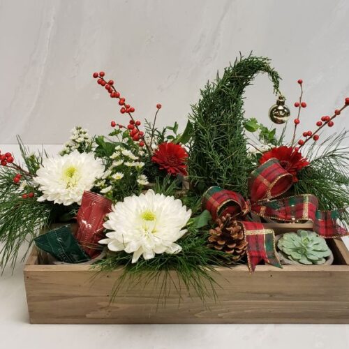 A set of 12 vintage pots in a wood crate filled with a mix of holiday treats including ornaments, pinecones, a succulent plant, assorted chocolates, with evergreens, fresh holiday blooms and a whimsical miniature Christmas tree.
