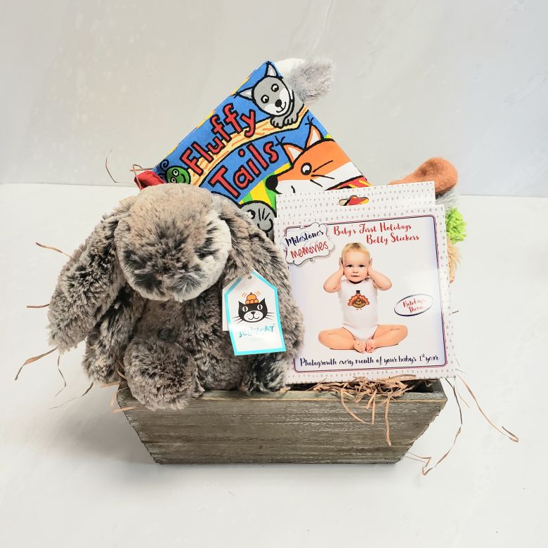 This darling gift basket includes the softest Jelly Cat Woodland bunny along with a crinkle touch baby book and a set of milestone stickers for taking keepsake pictures throughout the newborns first year.