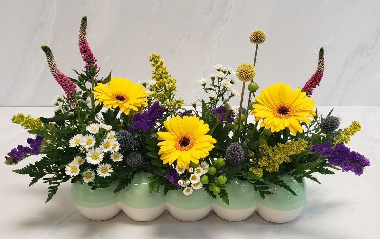 A wild mix of sweet miniature blooms designed in an ombre ceramic planter.